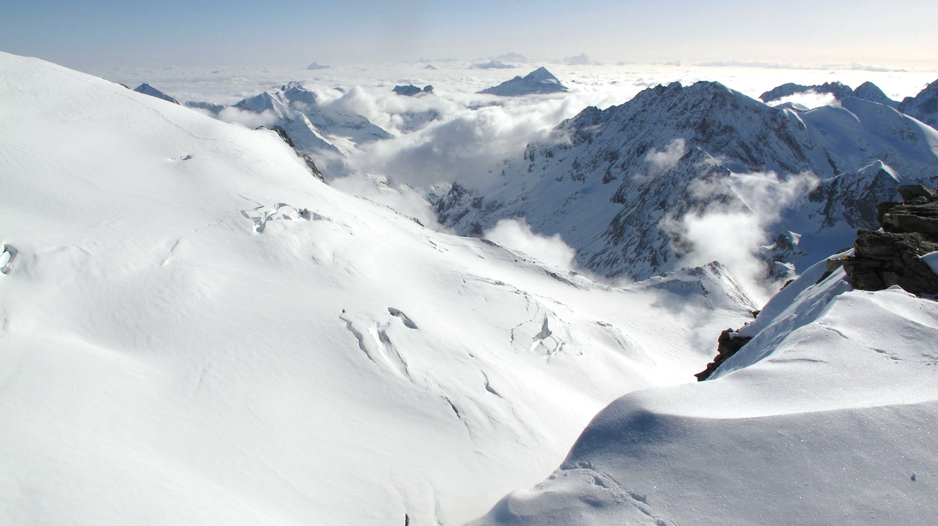 View from Tête Blanche south to the cloud-covered Valle d’Aosta and Gran Paradiso with neighbouring peaks.