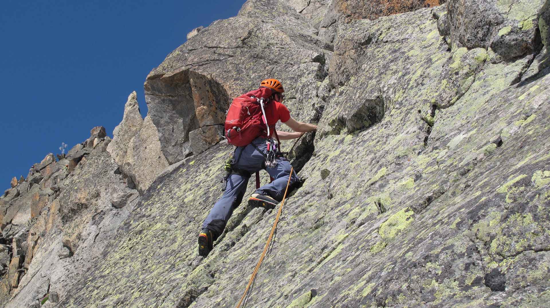 We start belaying in the key section, having climbed the first half of the ridge without using the rope