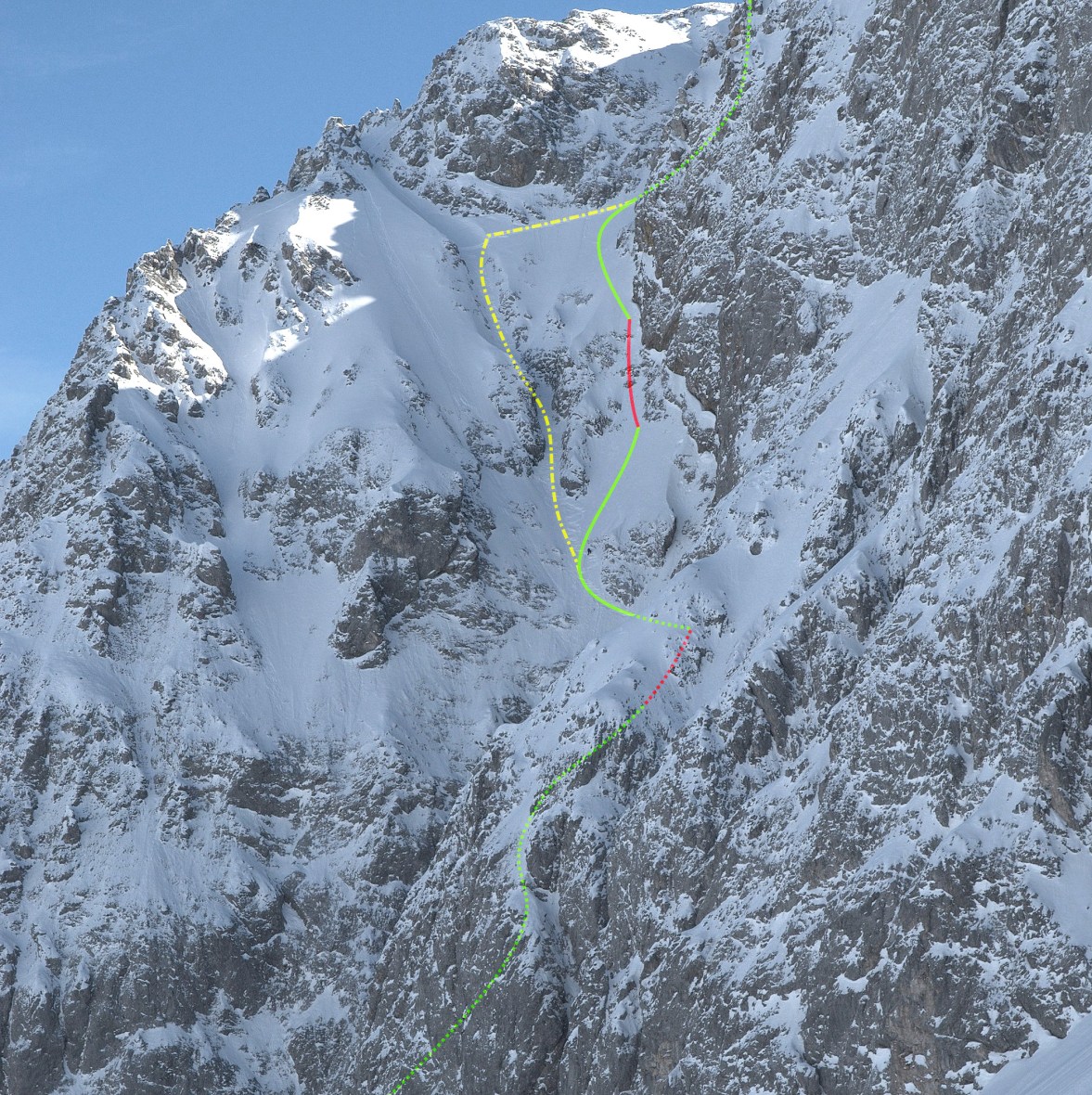 handschigline 12. May 2016 • 2042 × 2048 • Handschig The middle section of the ski line. red=abseil, dotted=hidden, yellow=alpenbock line. Photo (c) Alpenbock.de