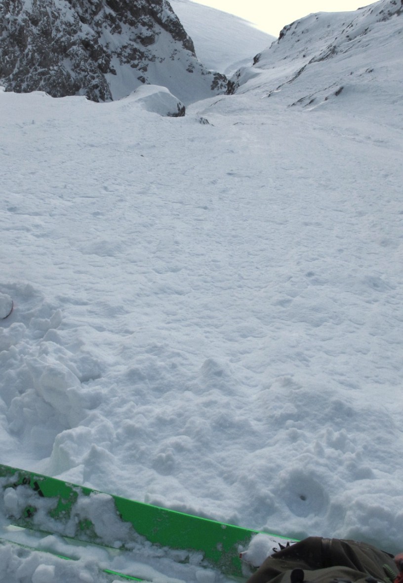 IMG_4117 23. March 2016 • 885 × 1280 • Handschig After the rocky part which took us some time to pass it, the terrain remains at 53° to 50° until we reach the mandatory rappel.