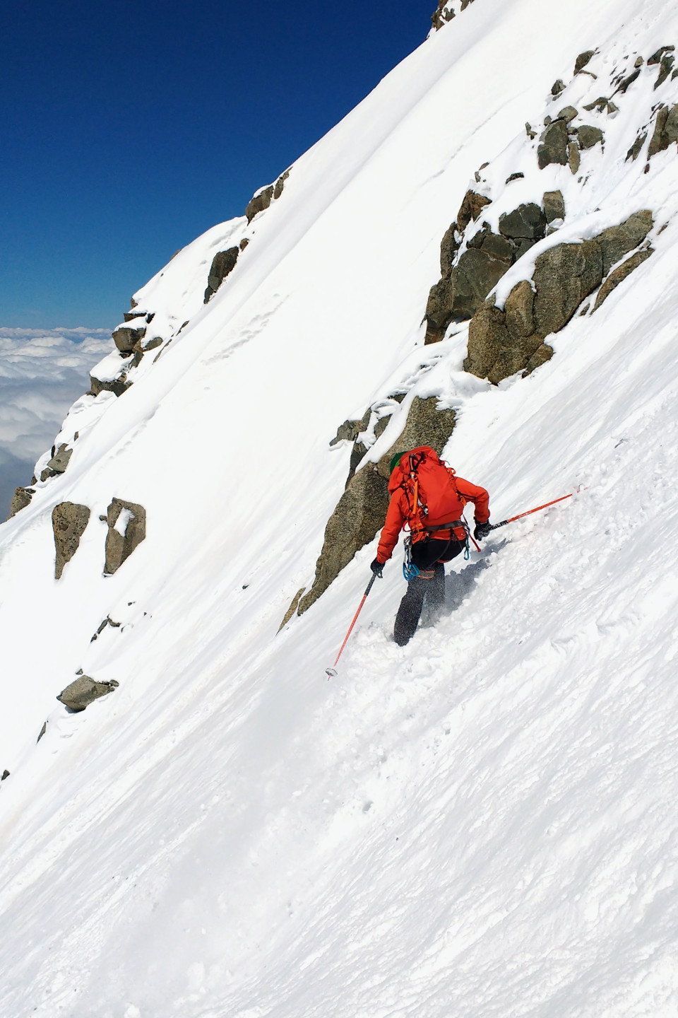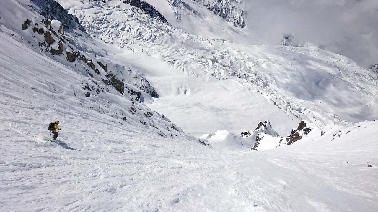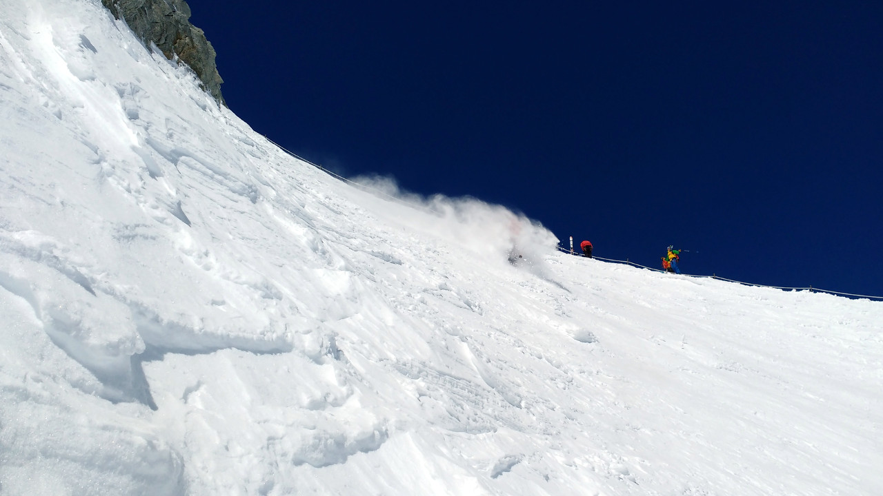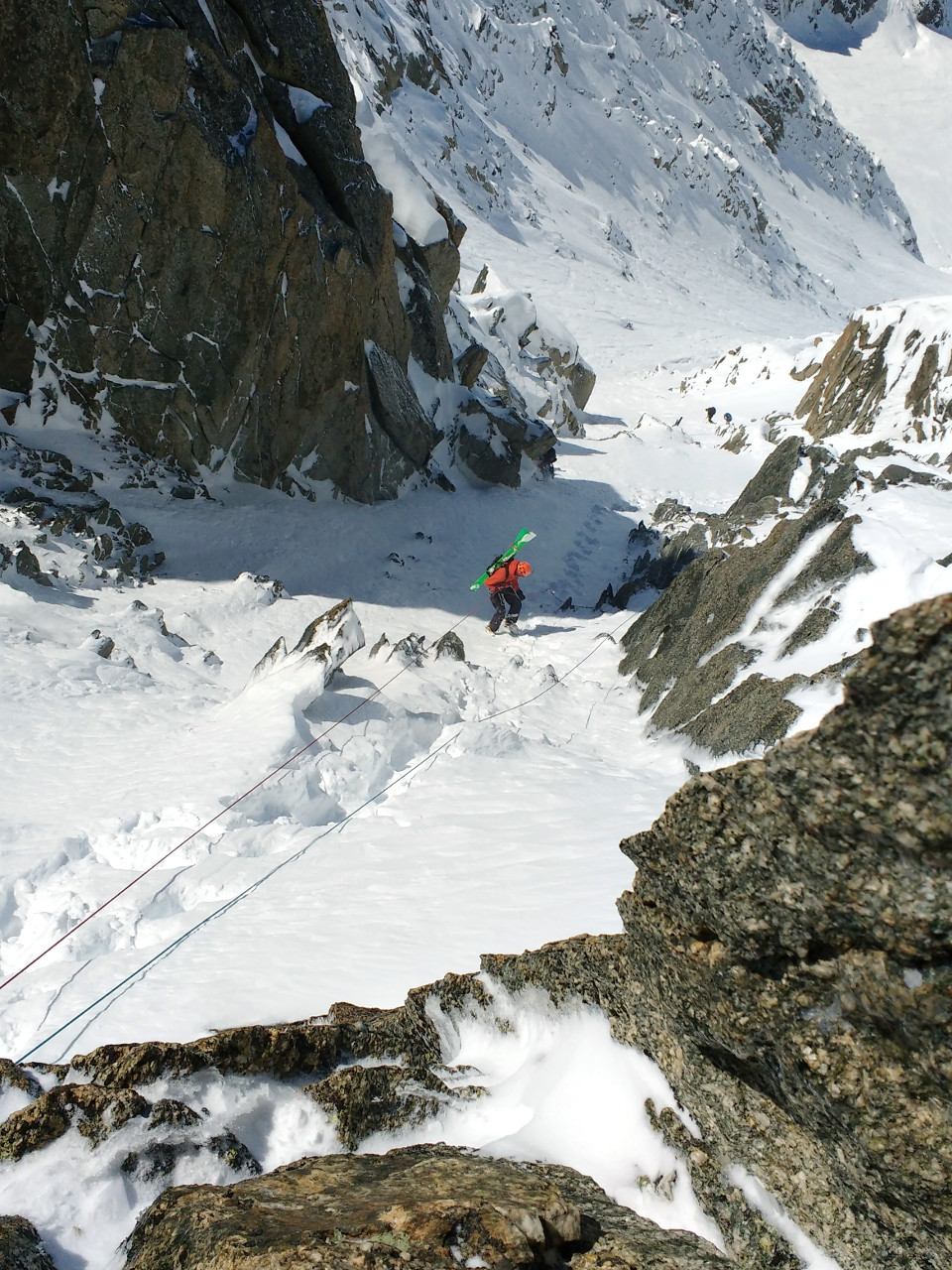 When we finally walked out the tunnel at the summit station, there was surprisingly no rush. Strong winds have destroyed lots of the fresh snow from the day before and conditions seemed everything but perfect. We had a look into the Cosmiques’ couloir which looked quite nice. A handfull of tracks, probably from skiers in the first bin, and only two groups abseiling. The first already finished and the second prepared their ropes. We watched them for a while, then decided to ski it as well and went over to the Rond’s entrance. The anchor over there isn’t bolted, but only one single rappel is needed…