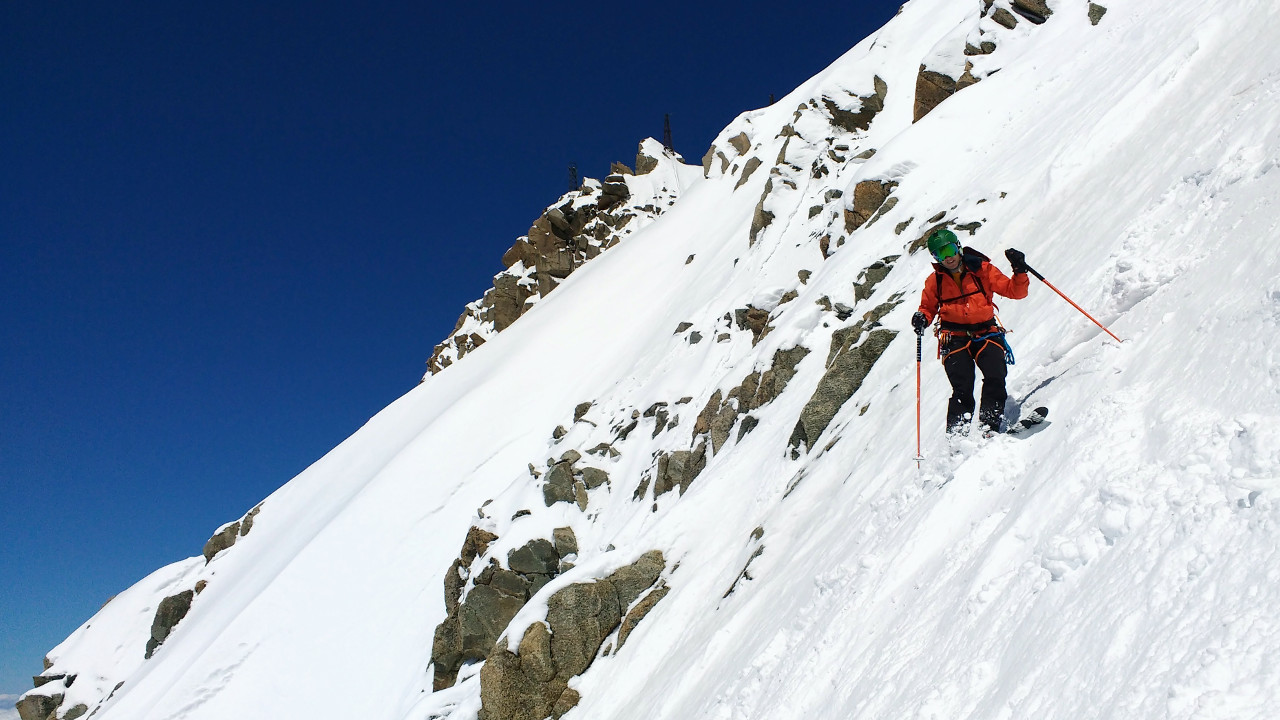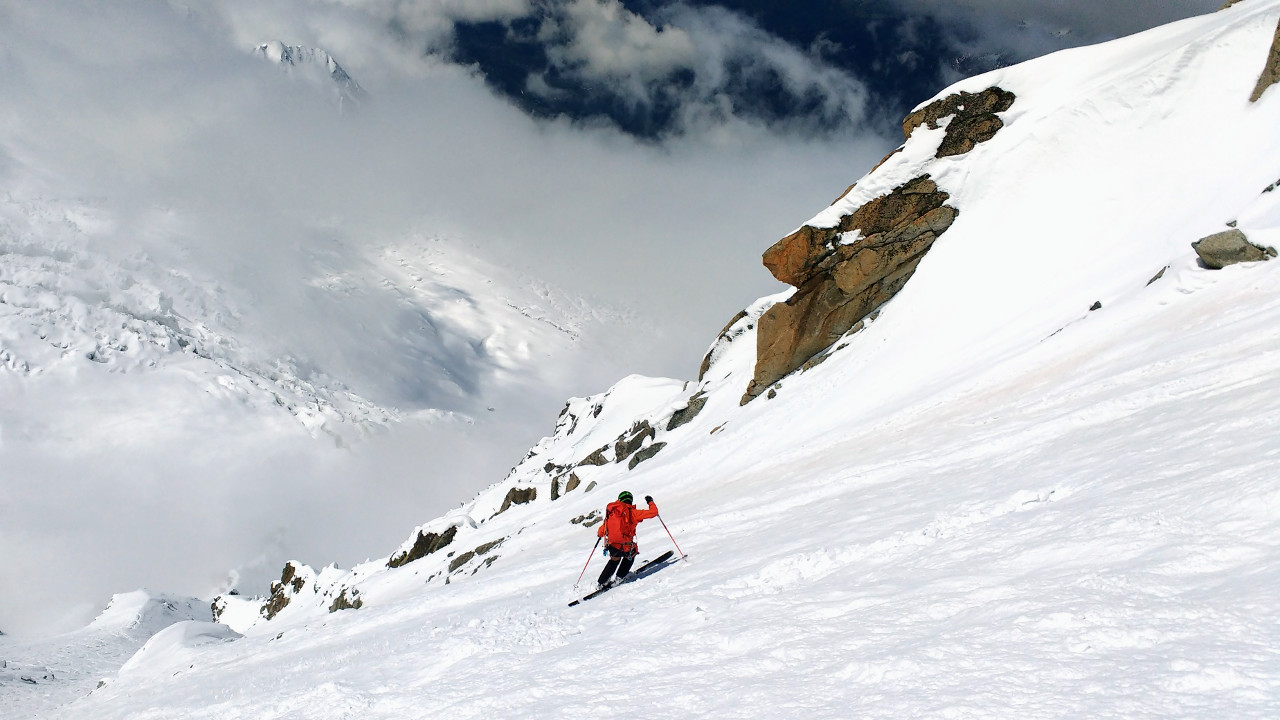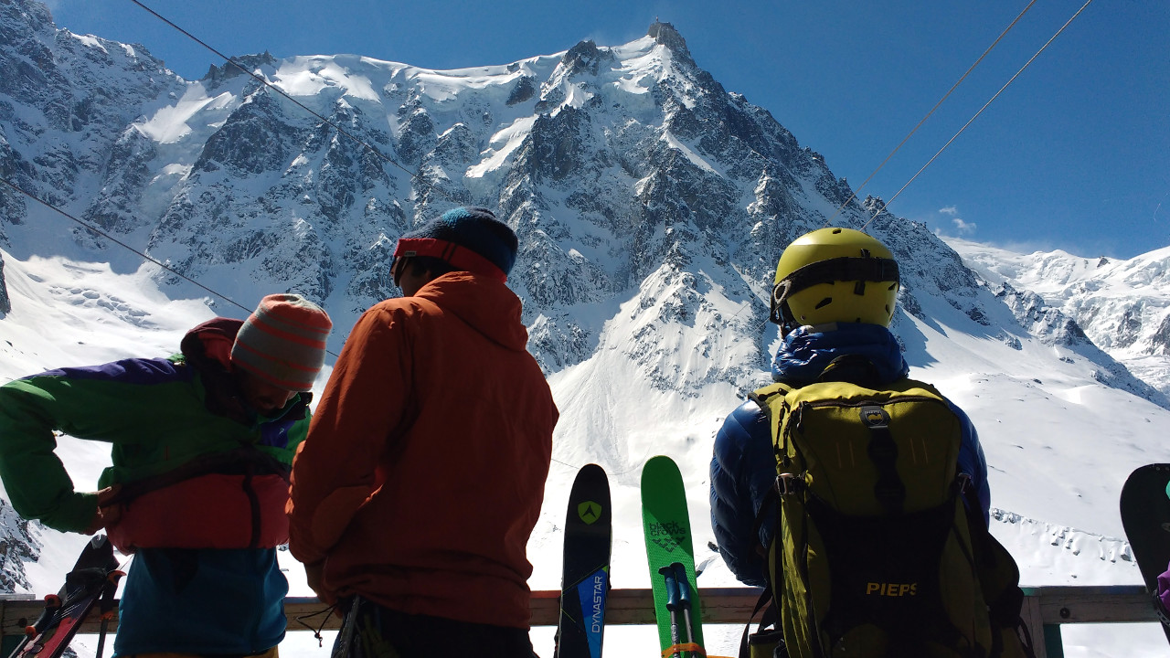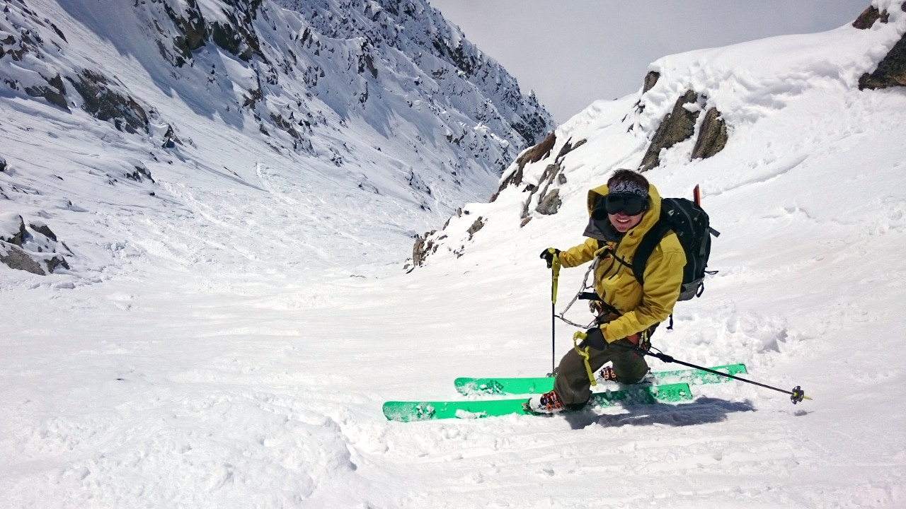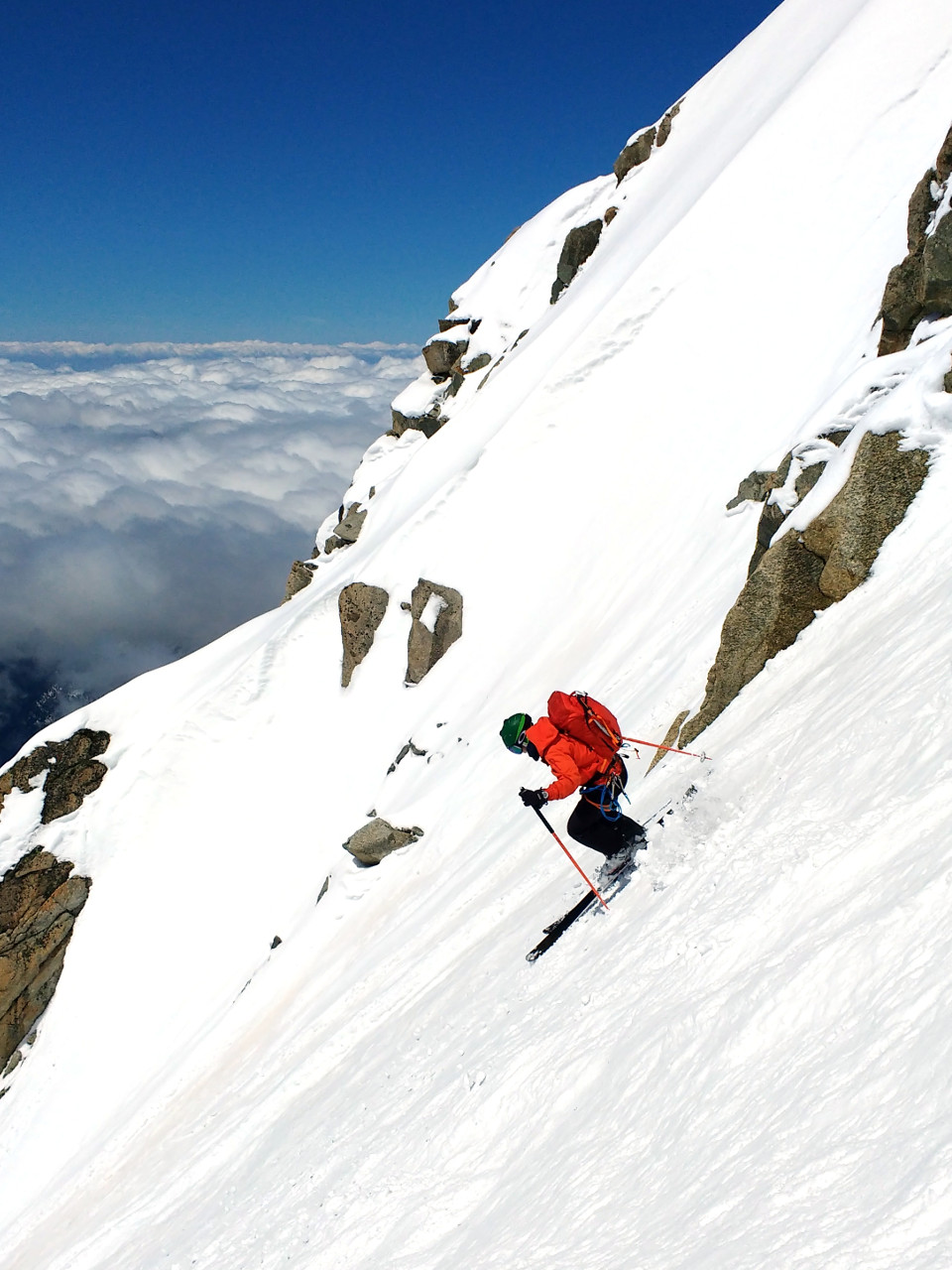 When we finally walked out the tunnel at the summit station, there was surprisingly no rush. Strong winds have destroyed lots of the fresh snow from the day before and conditions seemed everything but perfect. We had a look into the Cosmiques’ couloir which looked quite nice. A handfull of tracks, probably from skiers in the first bin, and only two groups abseiling. The first already finished and the second prepared their ropes. We watched them for a while, then decided to ski it as well and went over to the Rond’s entrance. The anchor over there isn’t bolted, but only one single rappel is needed…