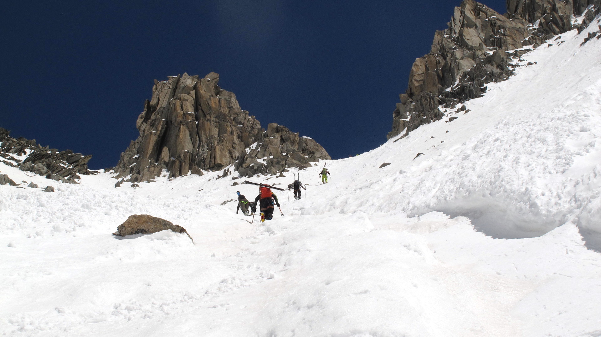 The only chance to find good snow during the last days was to follow these rules: North sector, wind protected, steep and above 2500m. There is not much to do in a single day when you want to stay on less extreme terrain. We thought the Capucin Couloir on Aiguille du Tacul might be a good choise and so did two other groups 😉