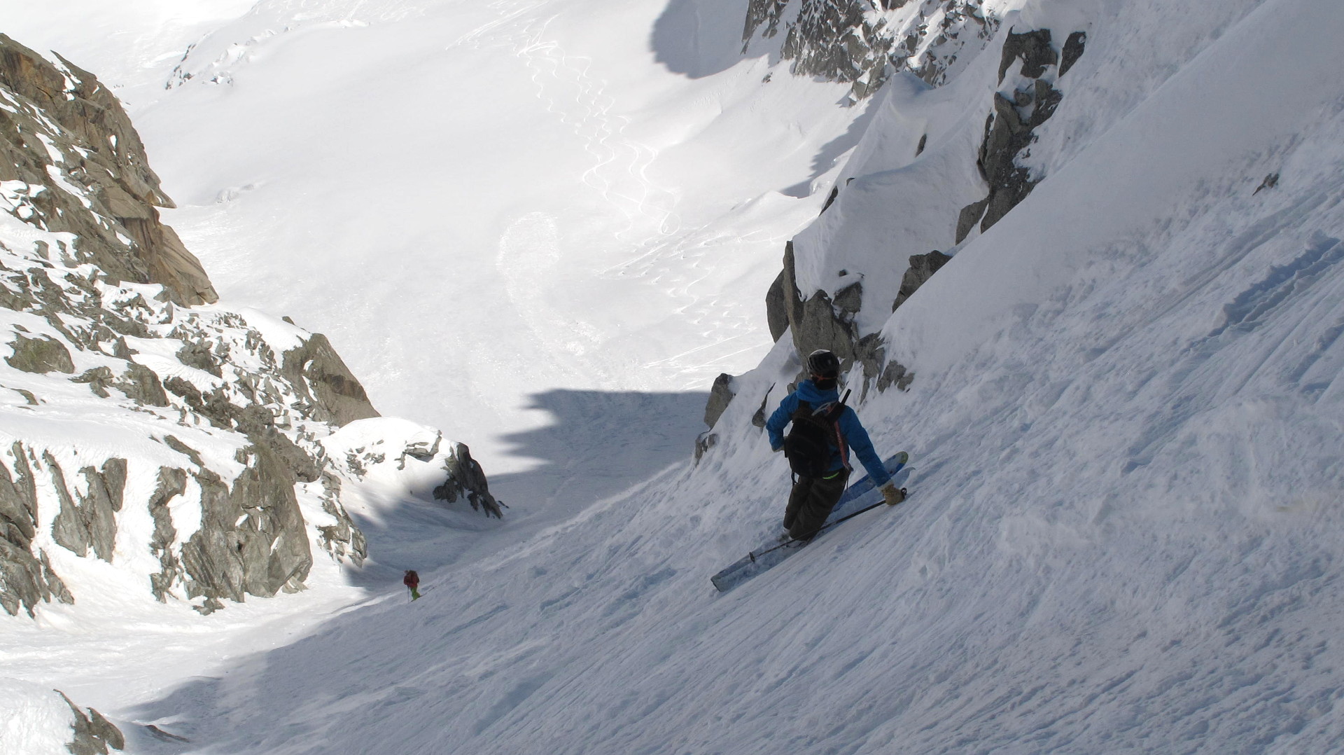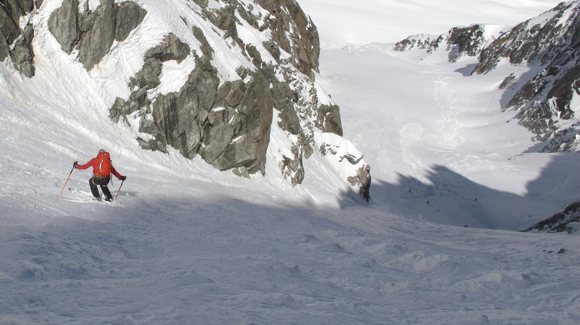 Fast rappels, facing backwards, with skis on. Always two people skiing and two on the rope worked perfectly. From the Col we all reached Leschaux Glacier in less than one hour. The couloir itself was sluffed off, the lower half skied really well, while to top section was quite a struggle with the own mind.