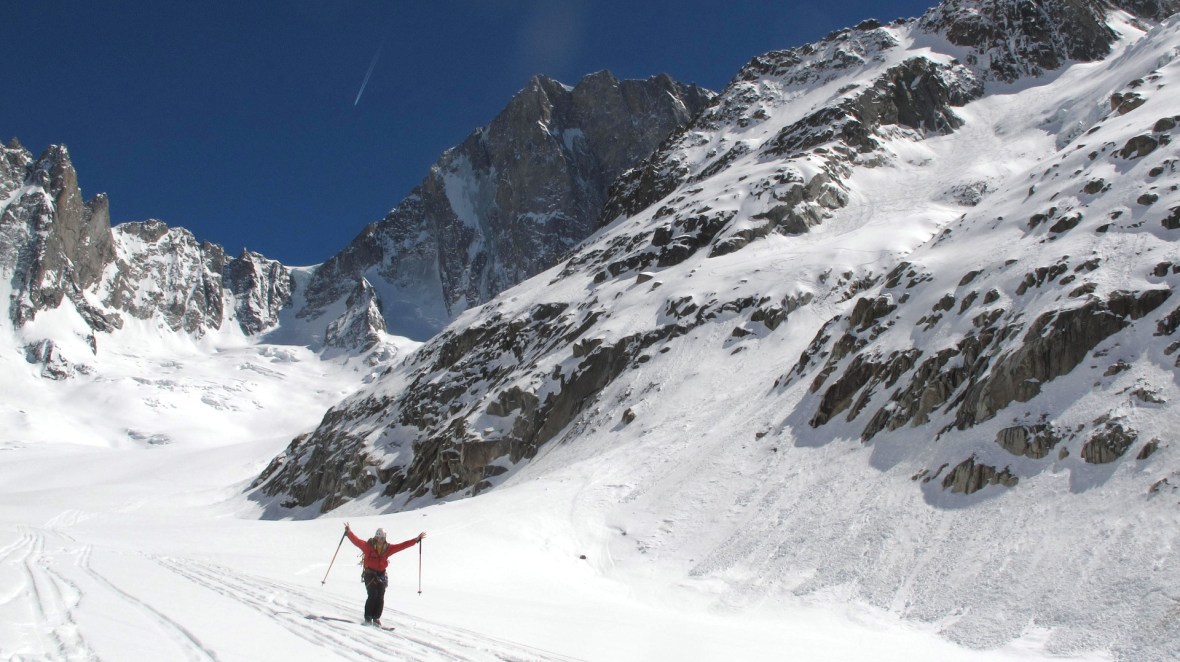 IMG_5886 4. May 2016 • 1920 × 1078 • Col du Tacul – traverse Totally high on Glacier Leschaux. Unbeatable scenery with the Grandes Jorasses in the back.