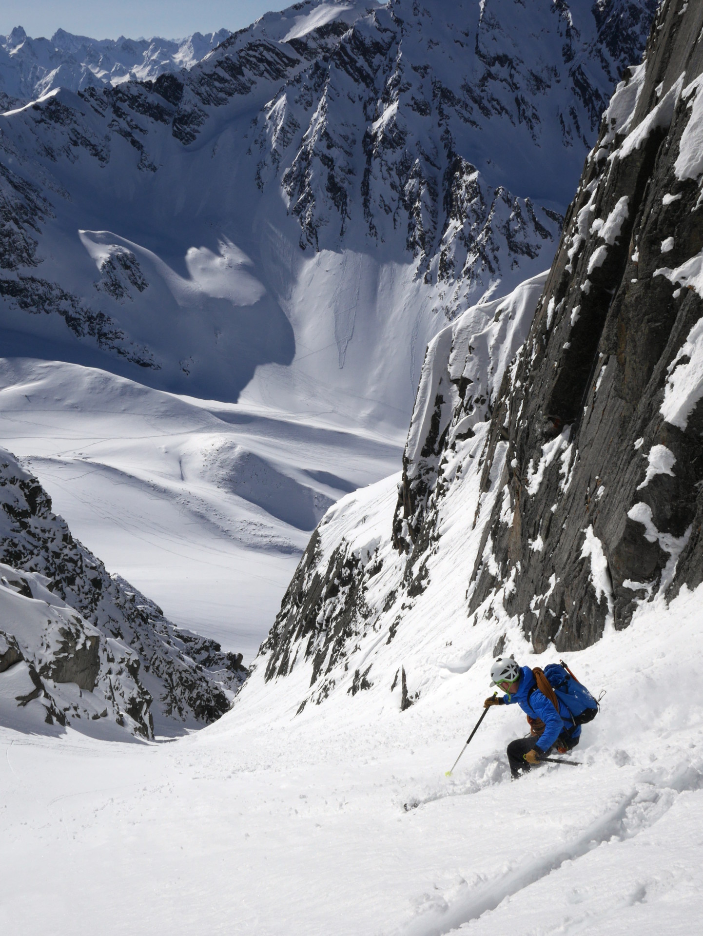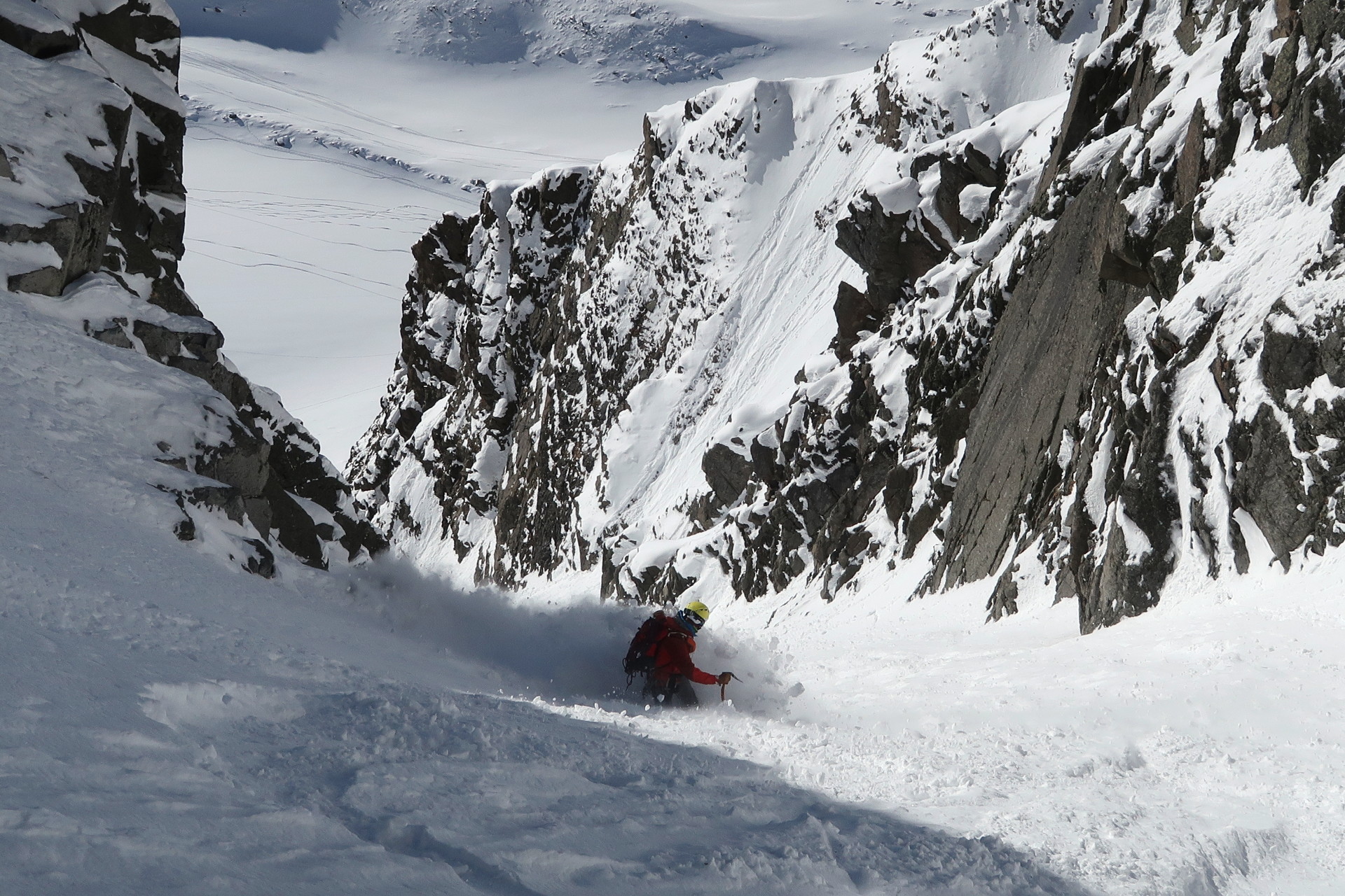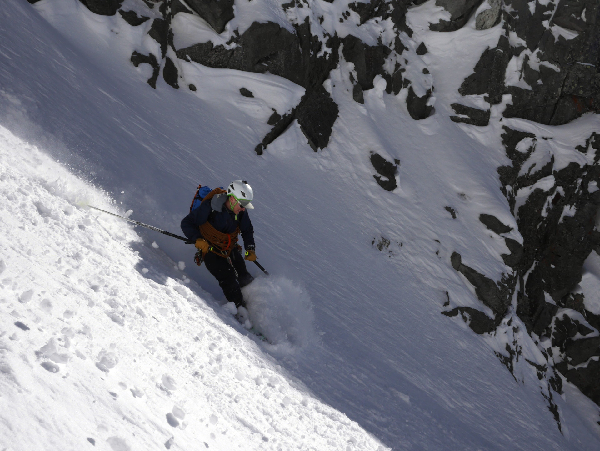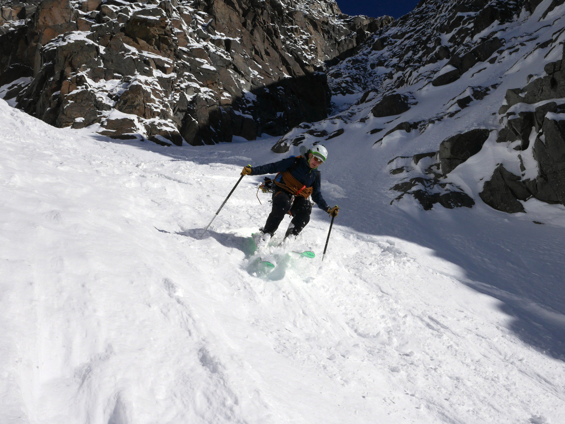 The skiing itself is never too steep and pure joy in good snow conditions. The west-facing aspect of the couloir should make for no timing issue. However, finding and setting up the rappel anchors can be quite time-consuming! Something potential repeaters should keep in mind.
