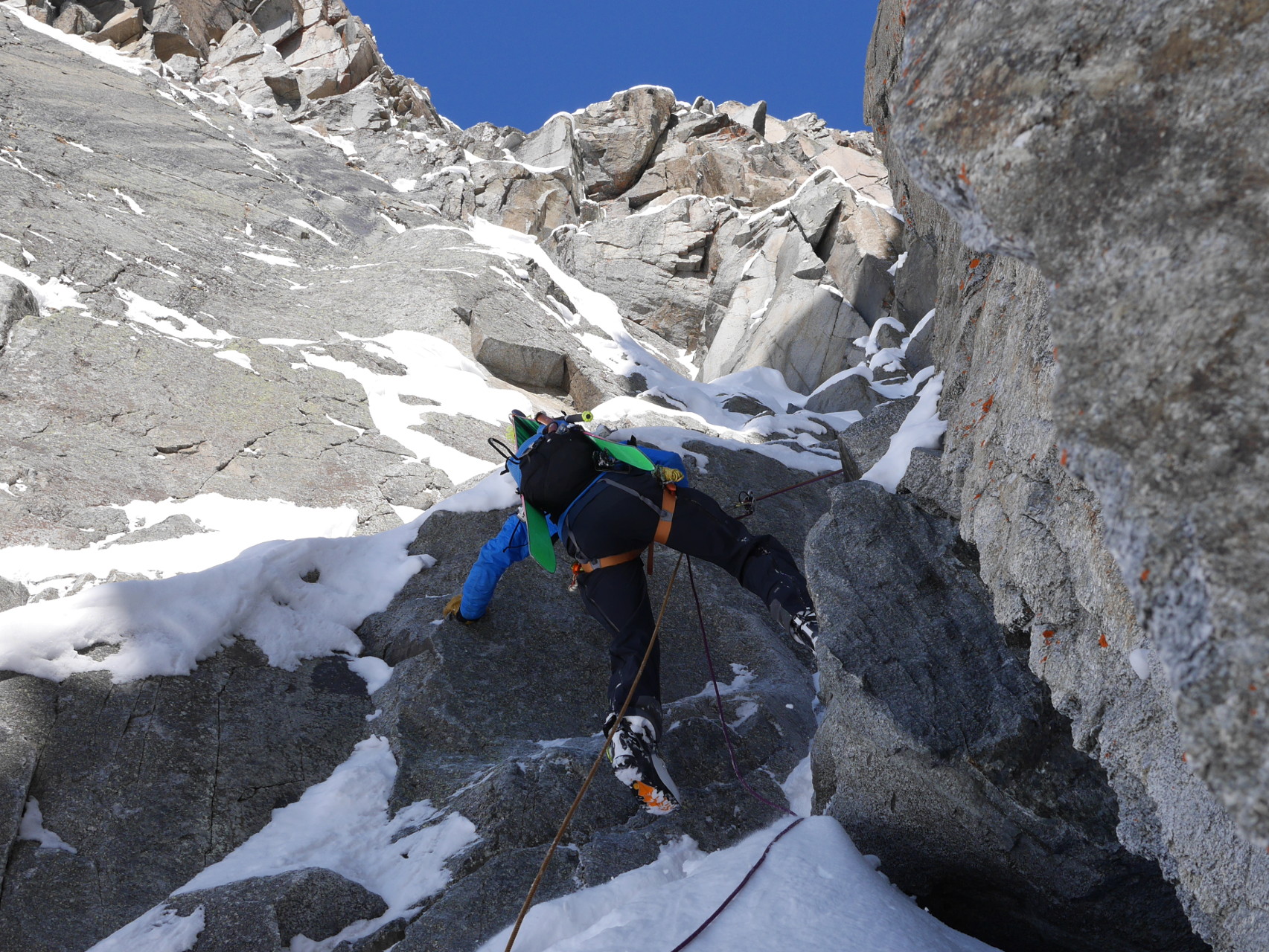 Hey adrien, can you share more information about the entrance of the couloir/place of the anchor for the first rappel and any hints how you build the second anchor and how to find it? Did you use pitons which maybe still are in good conditions?