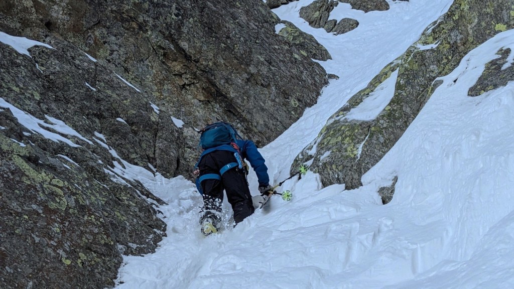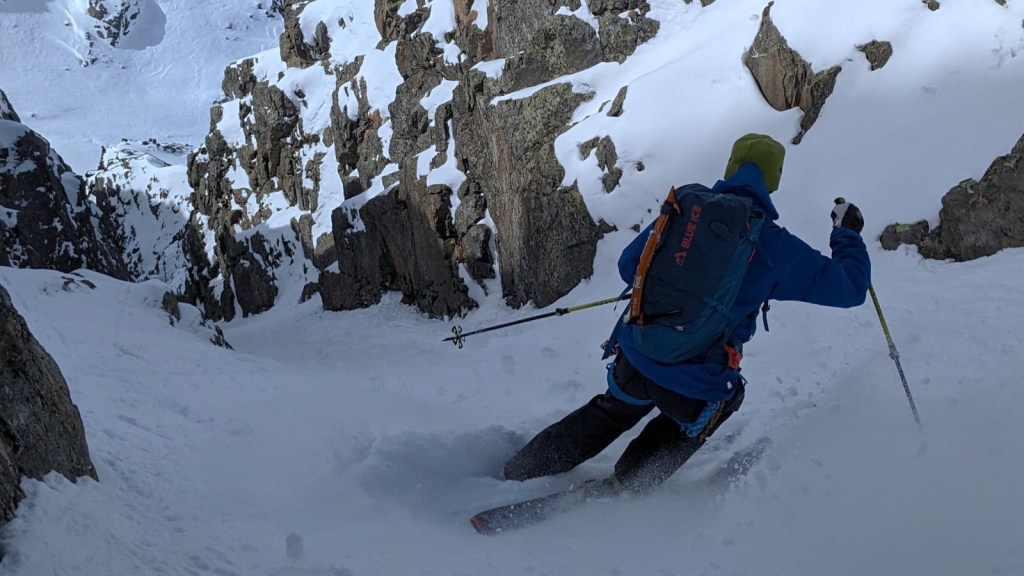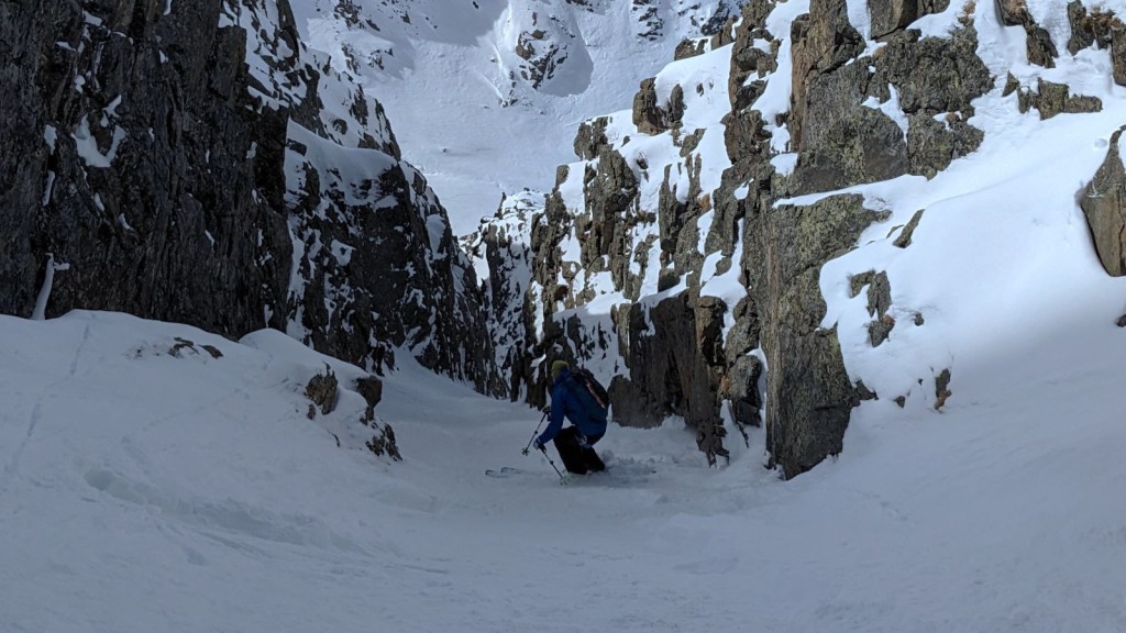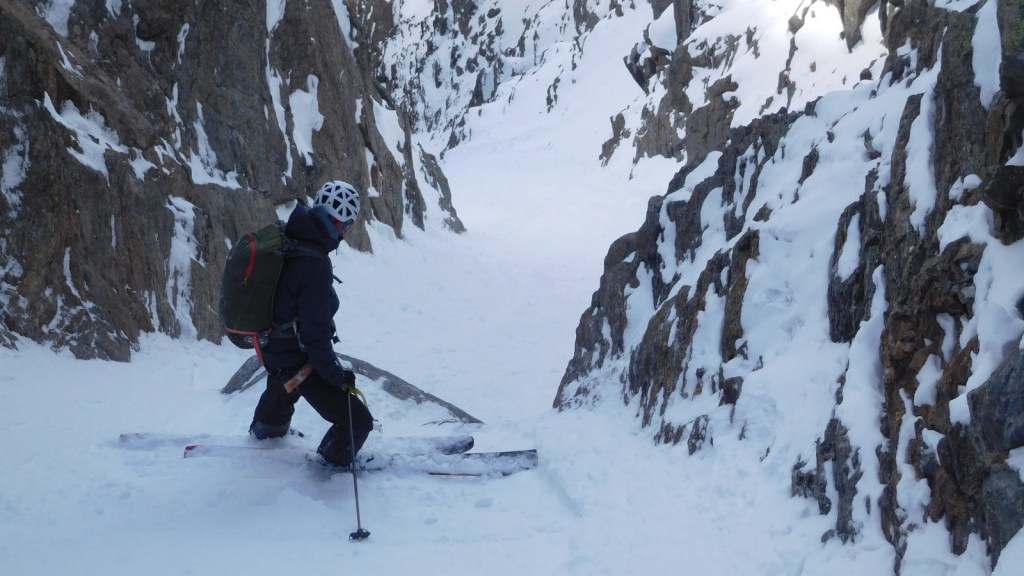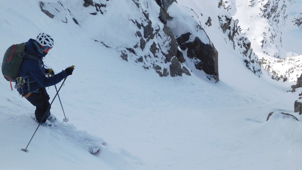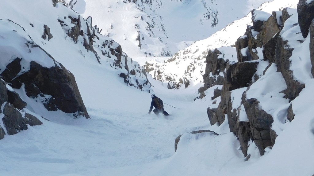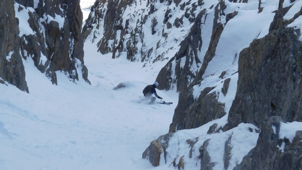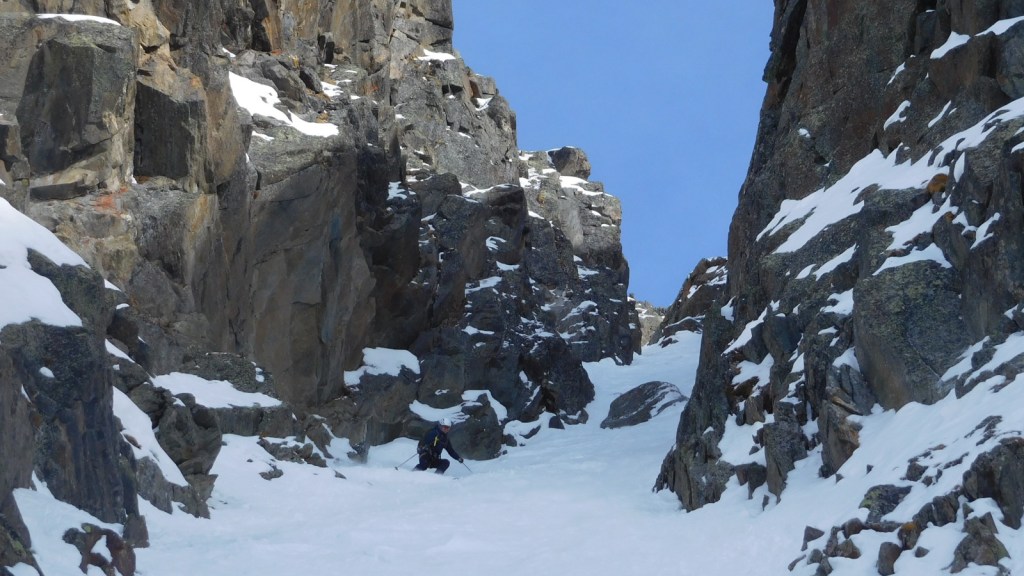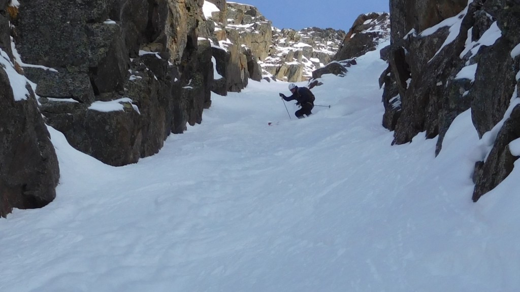 After around 1/3 down, the line becomes remarkably steeper (around 45°) and is also deeper entrenched into the mountain. Towering walls of granite rock surround you as you ski down. A real gem for couloir lovers.