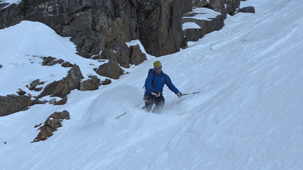 At the end of January we still had doubts about the quantity and quality of snow in there. Instead of hitting this line, we went to the area of the Winnebachseehütte / Hoher Seeblaskogel at my suggestion back then. After an enforced pause of several weeks (🤧) and unfortunately little change in the snow depth, last weekend we went again to the Stubai Alps. Without much hope for good snow, we set off on a ski tour in the immediate vicinity of the Amberger Hütte. The weather was perfect, but the snow on the ascend was of poor quality for a long time. We initially followed the route towards the well-known “Schrankogel”, but soon left the track to turn towards the summit of “Bockkogel”. We had the whole mountain to ourselves and, according to the hut wardens, hardly any ski alpinists go up there. The couloir then extends over 600 vertical meters to the west. After a few meters of descent on foot, the couloir unexpectedly offered both: good powder snow but also 2-3 rocky steep steps further down. Fortunately, these steps posed no problem for us and we were able to descend the couloir safely.