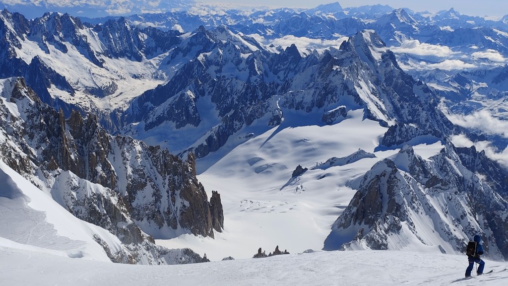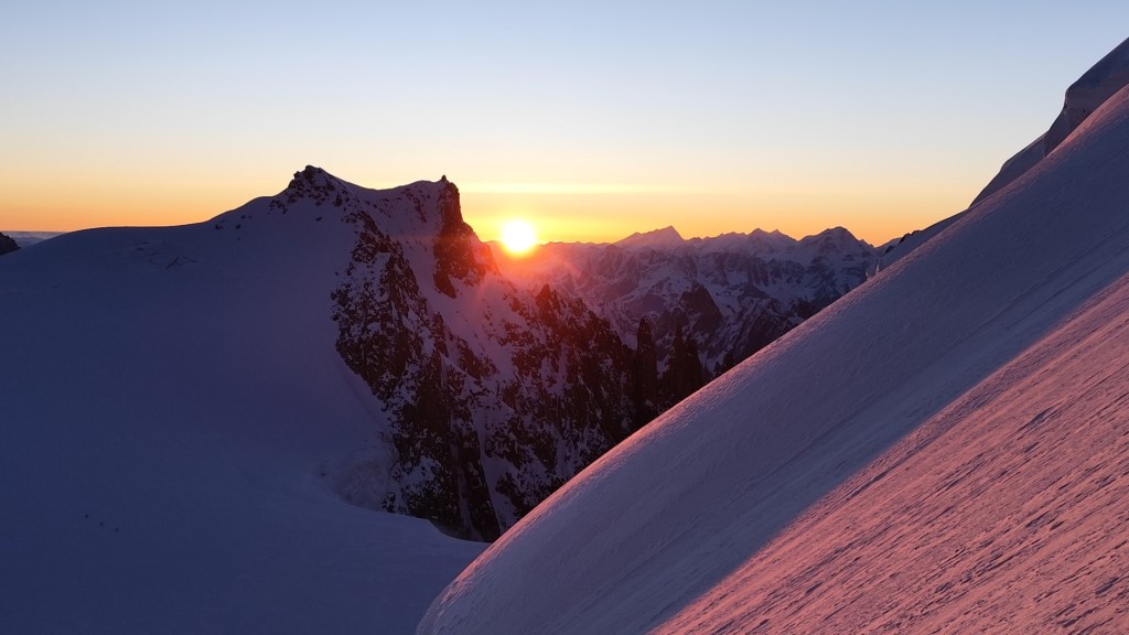 Ten years after my first experience in the Mont Blanc massif, I finally, almost casually, achieved a long-held goal: climbing and skiing down Mont Blanc! For this incredible high-alpine adventure we chose the super scenic “Trois Monts” route. We started with a very early ascent from the Cosmiques Hut, facing freezing temperatures and strong winds during the summit push. Reaching the summit was incredibly rewarding, with good weather and great panoramic views. The entire experience, from the frigid pre-dawn start to the near endless ski descent, was unforgettable.
