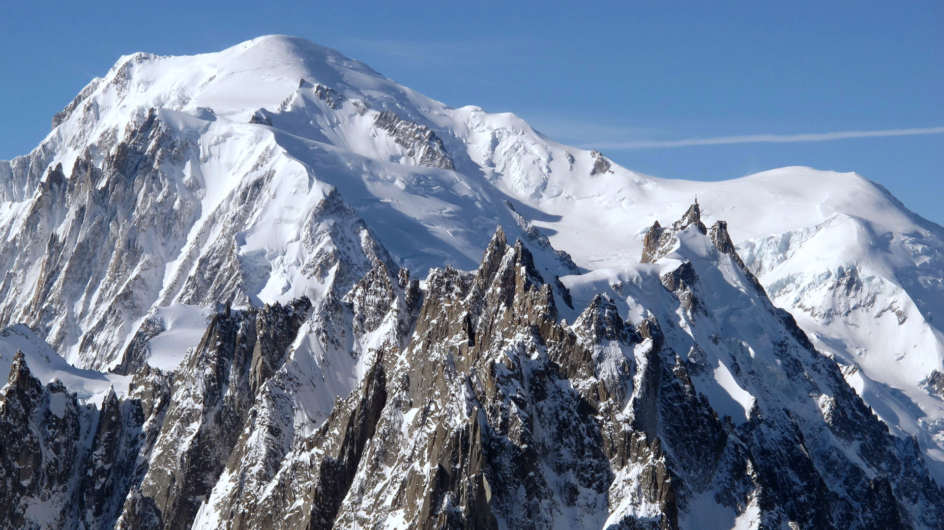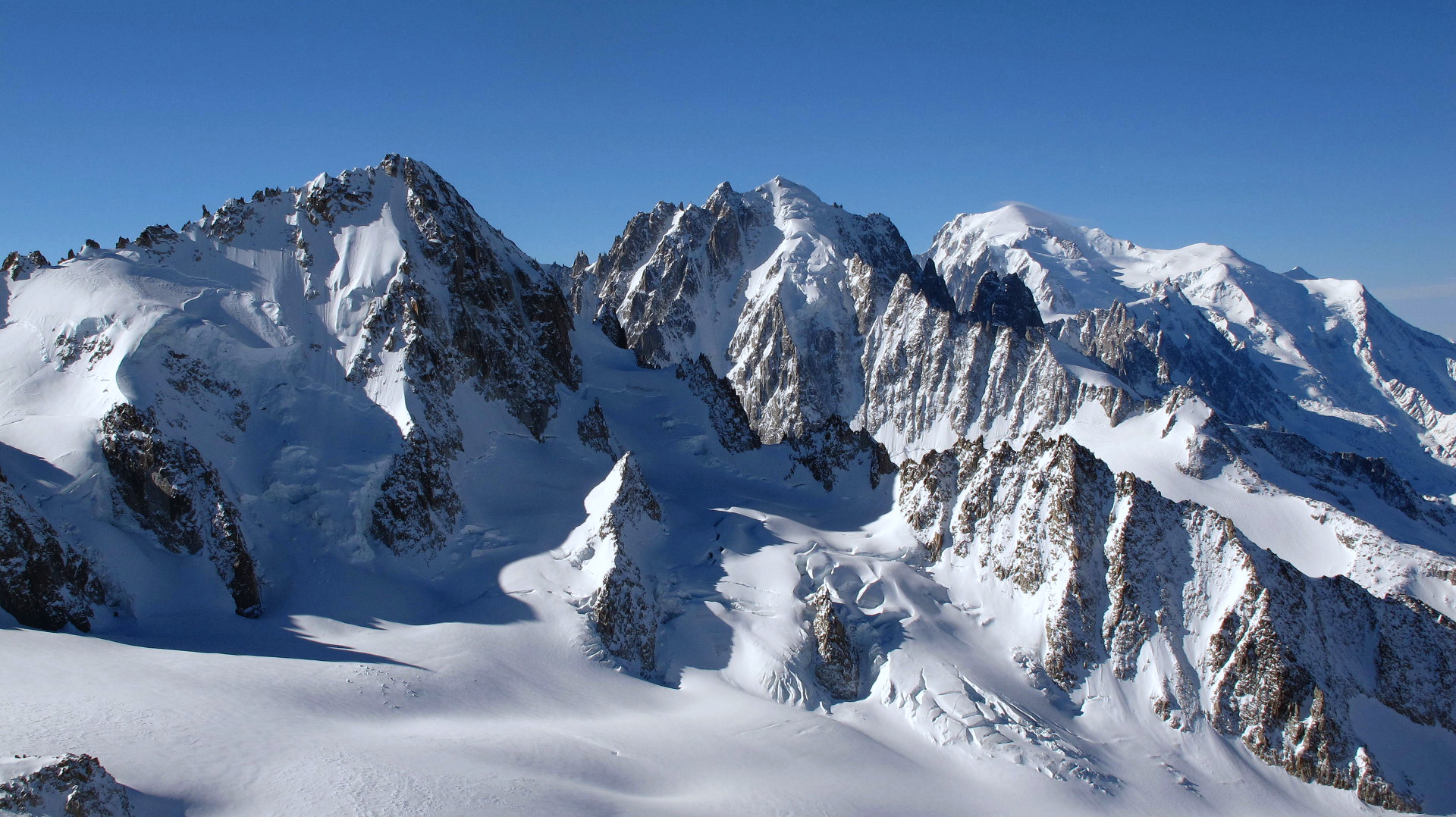 Aiguille du Chardonnet (front left), Aiguille Verte (center) and Mont Blanc (far right)